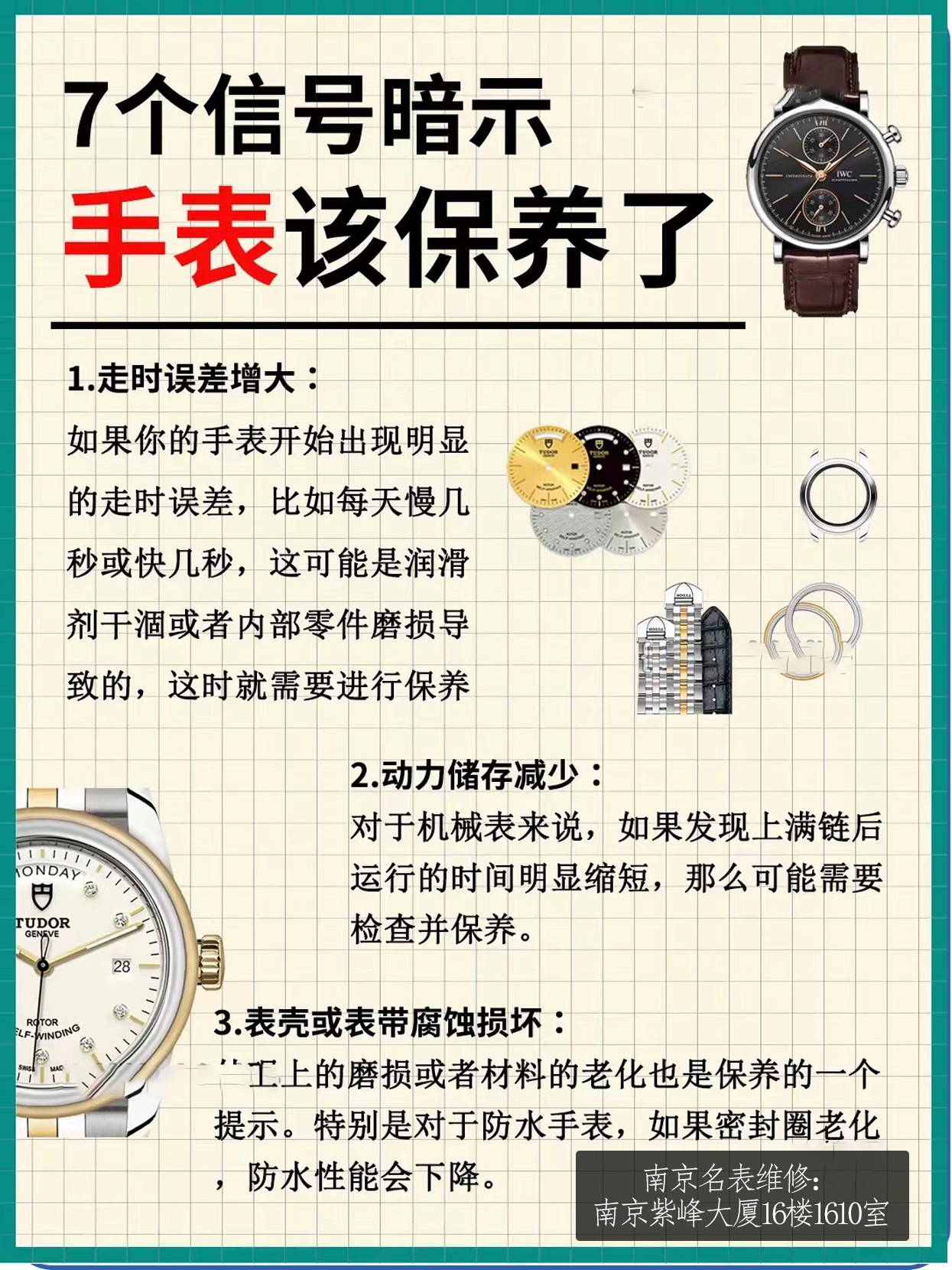 要讓手表始終保持良好的運行狀態(tài),了解一些手表維修保養(yǎng)知識及相關(guān)注意點至關(guān)重要。以下便是南京市鼓樓區(qū)中山北路2號紫峰大廈辦公樓16樓1610-1611室修表中心為大家總結(jié)的幾個關(guān)鍵方面。