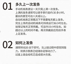 當手表停走或者長時間未佩戴重新啟用時,可以先輕輕旋轉(zhuǎn)表冠上發(fā)條,讓發(fā)條獲得一定的初始能量,然后再正常佩戴,讓擺陀在日常活動中繼續(xù)為發(fā)條補充能量。如果在手動上發(fā)條的時候感覺到有異常阻力,或者表冠無法正常旋轉(zhuǎn),要馬上停止操作,并將手表送到專業(yè)的手表售后維修中心進行檢查,以免造成更嚴重的損壞。