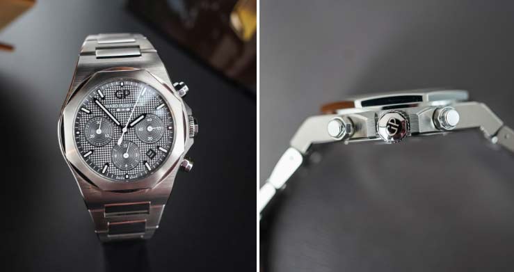 芝柏此次還對全新的Laureato Ti49腕表的表盤進(jìn)行了一定調(diào)整,它采用了板巖灰色主題,并通過巴黎飾釘紋進(jìn)行了點(diǎn)綴。計(jì)時子表盤和小秒盤均帶有著現(xiàn)代化的環(huán)狀蝸紋修飾,上面標(biāo)注了白色的數(shù)字刻度。表盤外緣的分鐘刻度環(huán)與鑲貼時標(biāo)聯(lián)結(jié)在了一起,后者連同中軸時分指針一起均做了拋光處理并涂覆了白色夜光材質(zhì),確保了低光環(huán)境下的可讀性。碩大的GP標(biāo)志被直接放置在了12點(diǎn)位處,既標(biāo)明了身份也起到了平衡布局的作用。