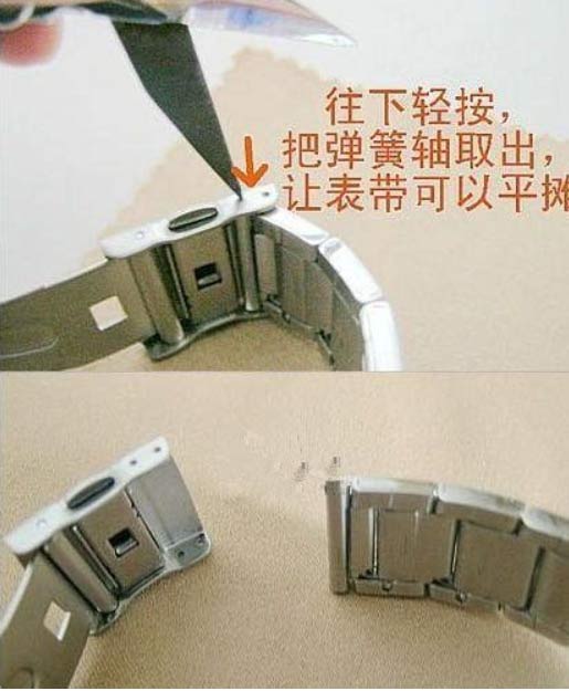 重新組裝:將表帶拆到合適尺寸后,斷成兩節(jié)的表帶需重新連接,插入鋼針固定,敲擊大節(jié)冒頭部分以避免劃傷表帶。 三、皮革表帶的拆卸